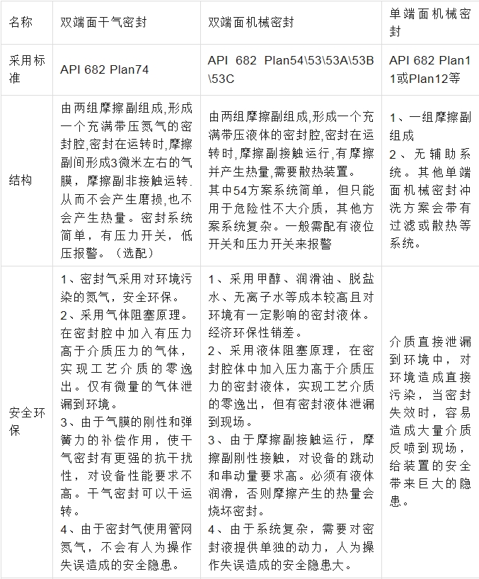 对比干气密封、双端面机械密封和单端面机械密
