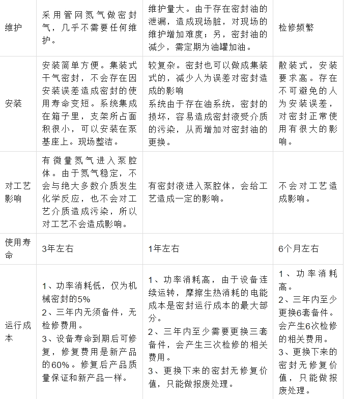 双端面干气密封与双端面机械密封,单端面机械密封之前各有什么优缺点: