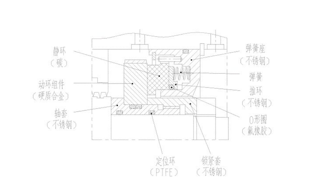 静环位于不锈钢弹簧座内,用副密封O形圈密封。弹簧在密封无负荷状态下使静环与固定在转子上的动环组件配合