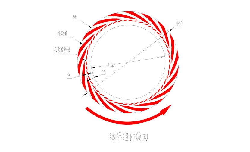 在动环组件和静环配合表面处的气体径向密封有其先进独特的方法。配合表面平面度和光洁度很高,动环组件配合表面上有一系列的螺旋槽,如下图所示。